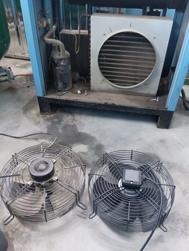 黃山空壓機冷干機維修,冷凍式干燥機風機損壞,現場更換新風機,裝上試機,冷干機運行正常,除水效果恢復如初,故障排除。黃山市屯溪,歙縣,休寧縣,祁門縣,黟縣,宣城市績溪縣,寧國市,旌德縣,涇縣,郎溪縣,周邊附近有需要空壓機和空壓機維修的友友們,可以來電咨詢。電話:18955932608